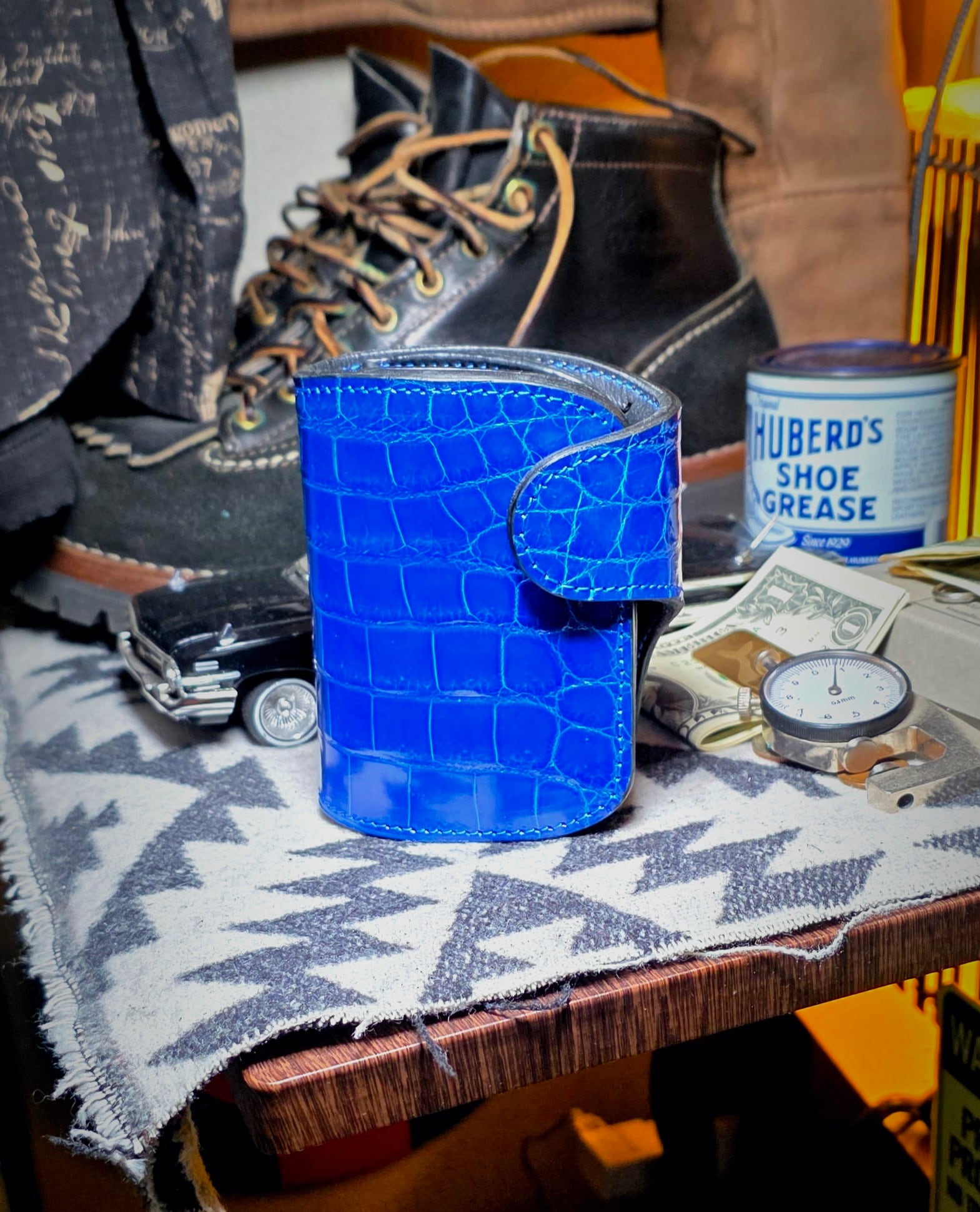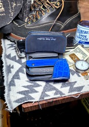 表革とコインケース蓋部分に、シャイニングロイヤルブルークロコダイル(スモールクロコダイル)、裏貼りはピッグスキン(ブラック)を採用。