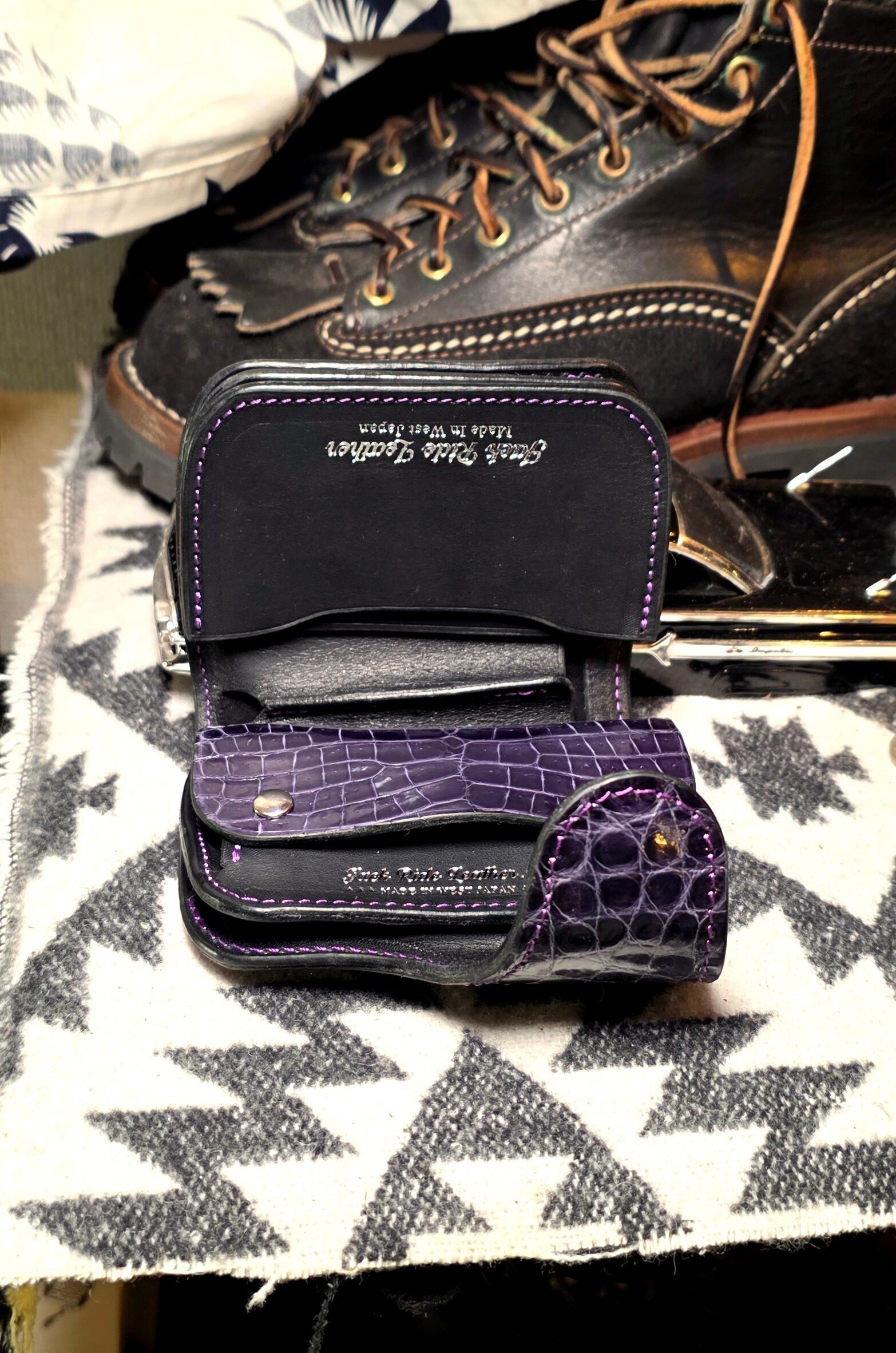 表革とコインケース蓋部分に、シャイニングミッドナイトパープル(スモールクロコダイル)、裏貼りはピッグスキン(ブラック)を採用。