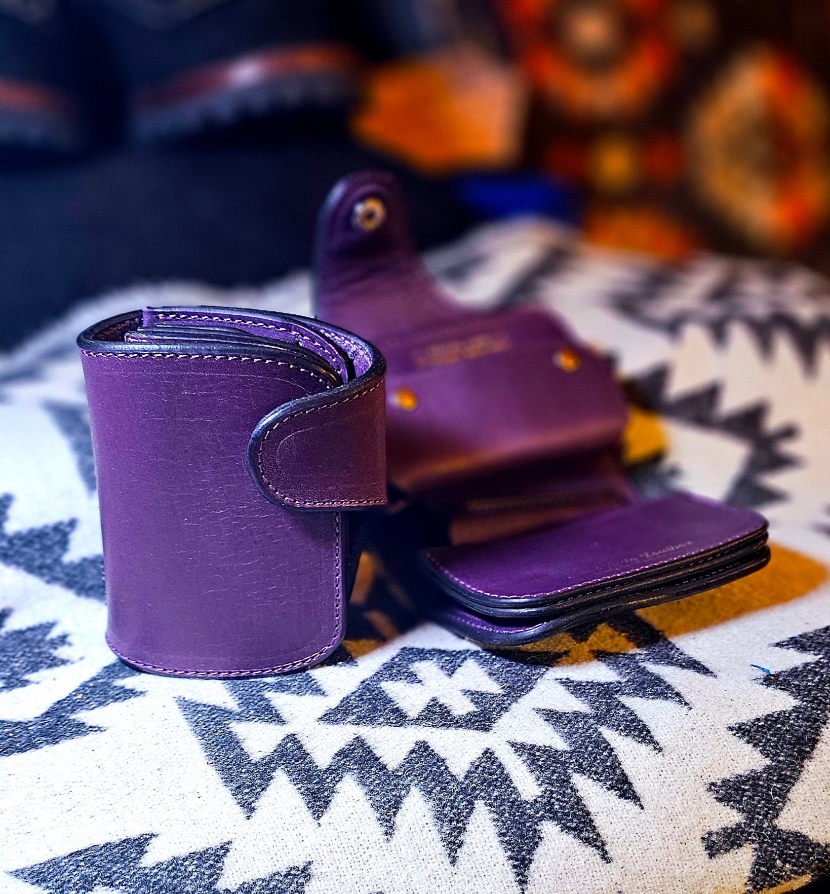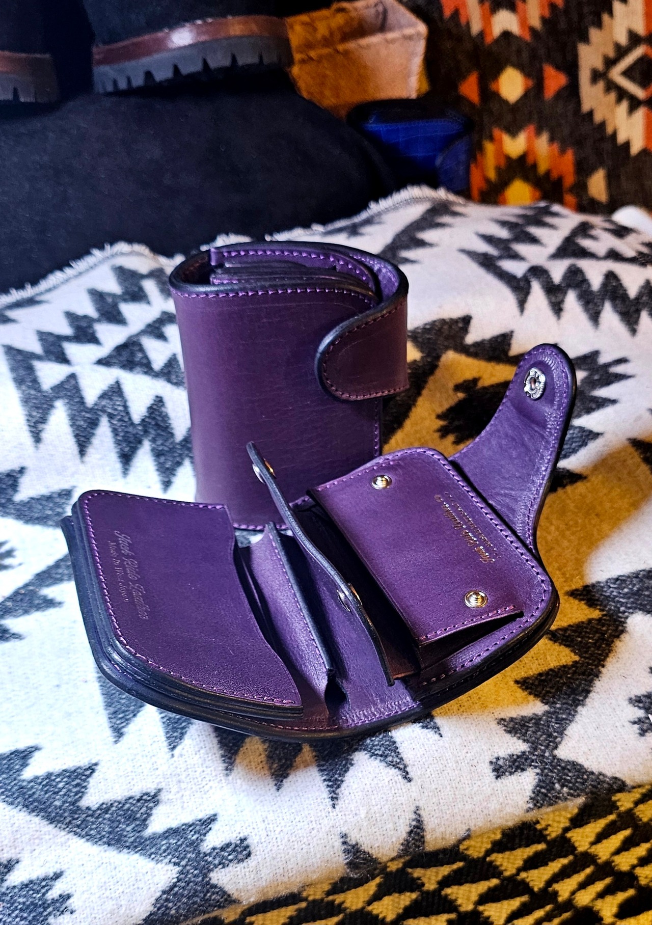 オールパープルのオイルレザーに、パープルステッチ。シルバー色金具とロゴ銀箔押。
