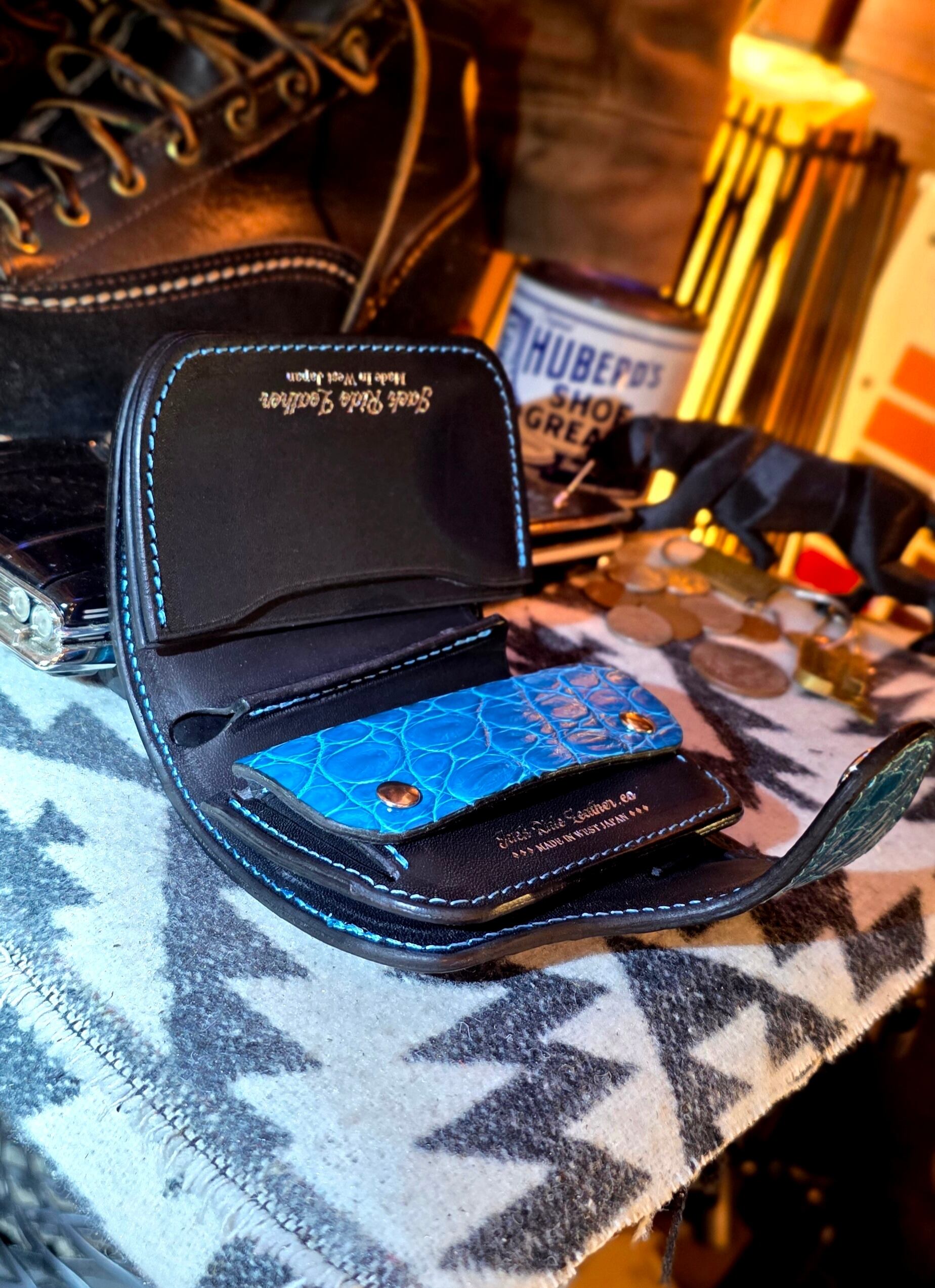 表革とコインケース蓋部分に、シャイニングクロコダイル(スモールクロコダイル)、裏貼りはピッグスキン(ブラック)を採用。