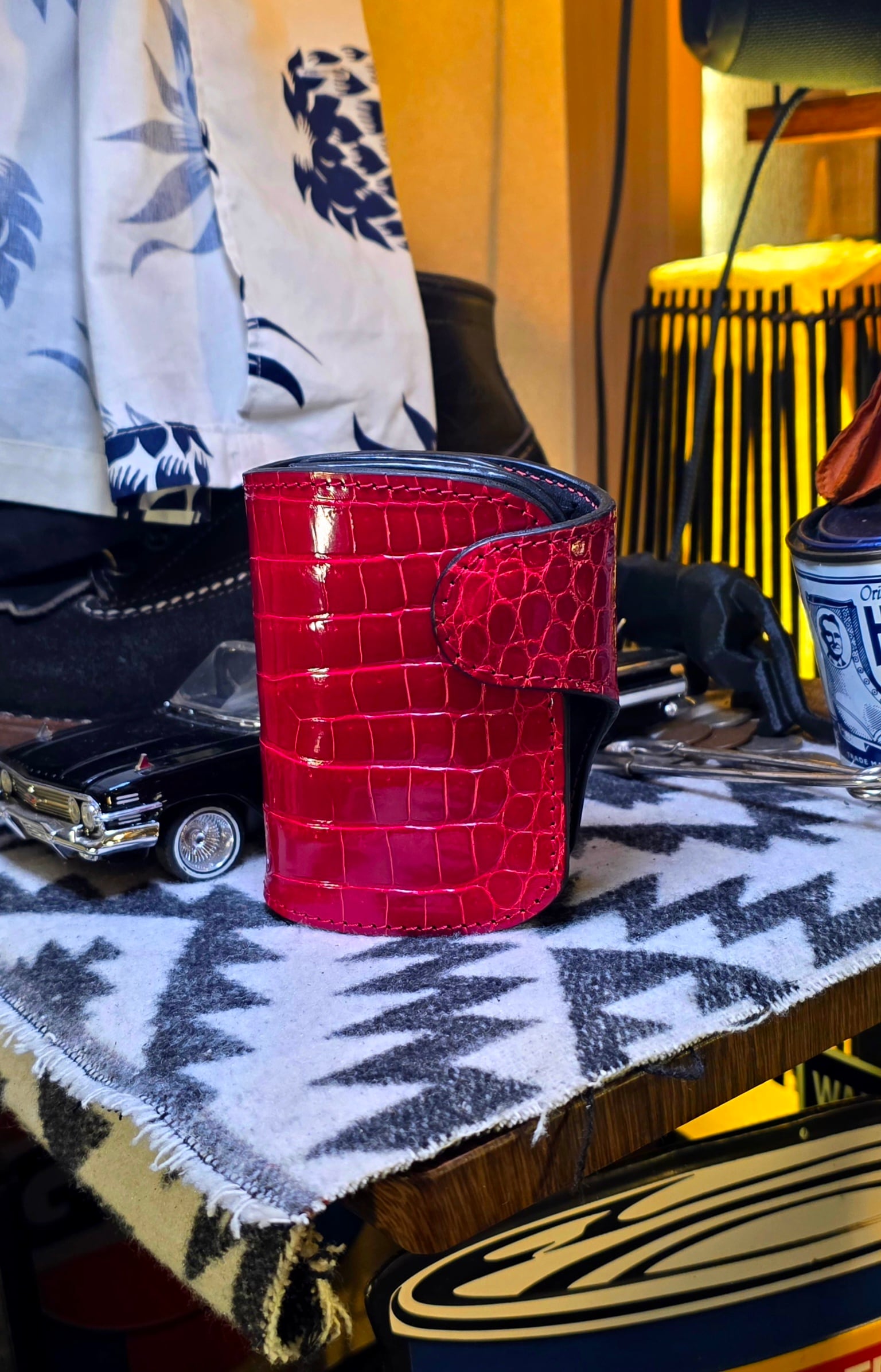 表革とコインケース蓋部分に、フレイムレッド(スモールクロコダイル)、裏貼りはピッグスキン(ブラック)を採用。