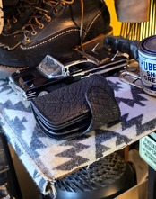 ブラックステッチに映える、銀箔押しロゴ。
