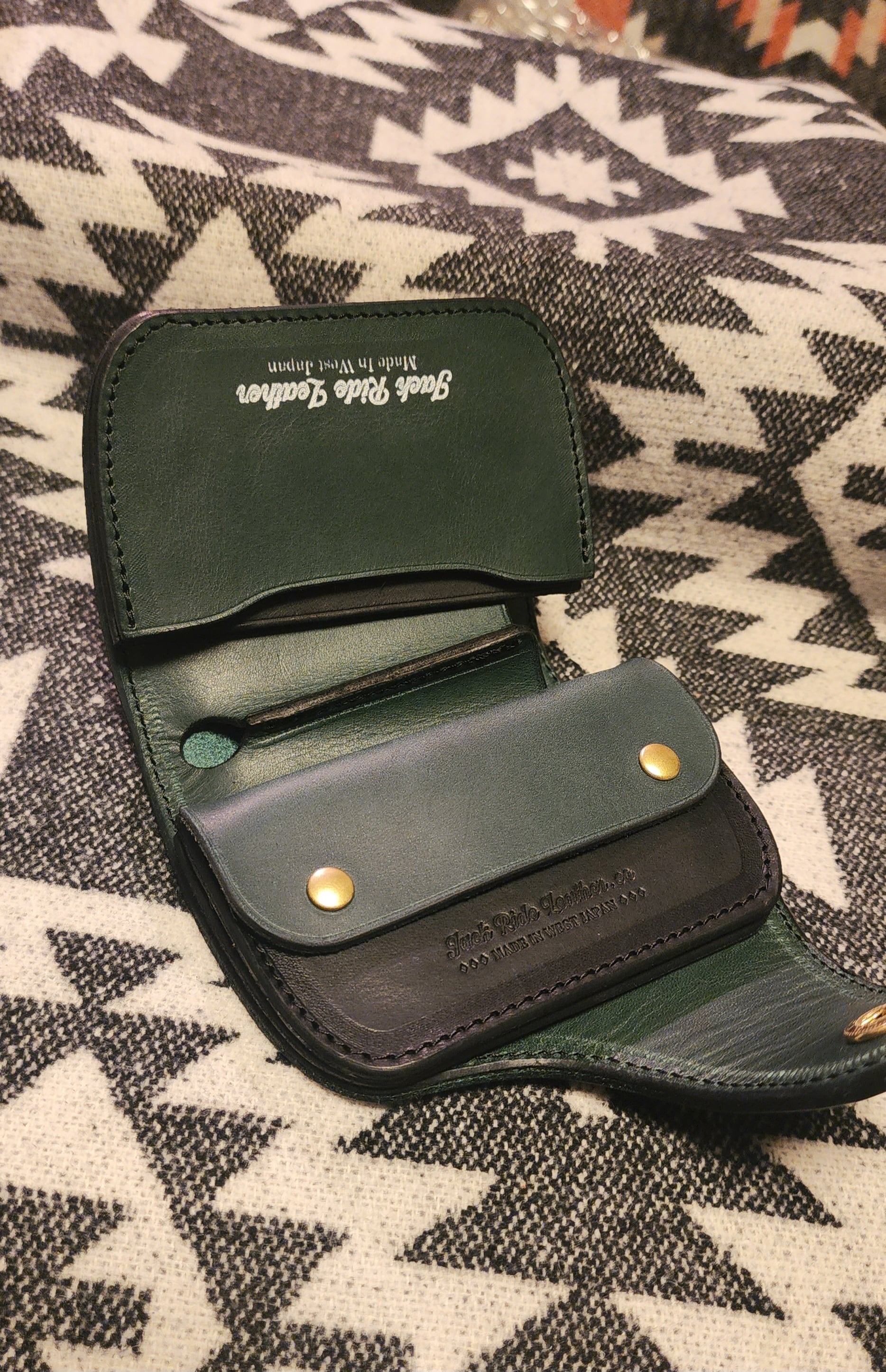 エルヴァケーロ迷彩オイルレザーを表革に、内装には表革に合わせたエルバマット、ステッチブラック。ロゴマークは映える白箔押しを採用。