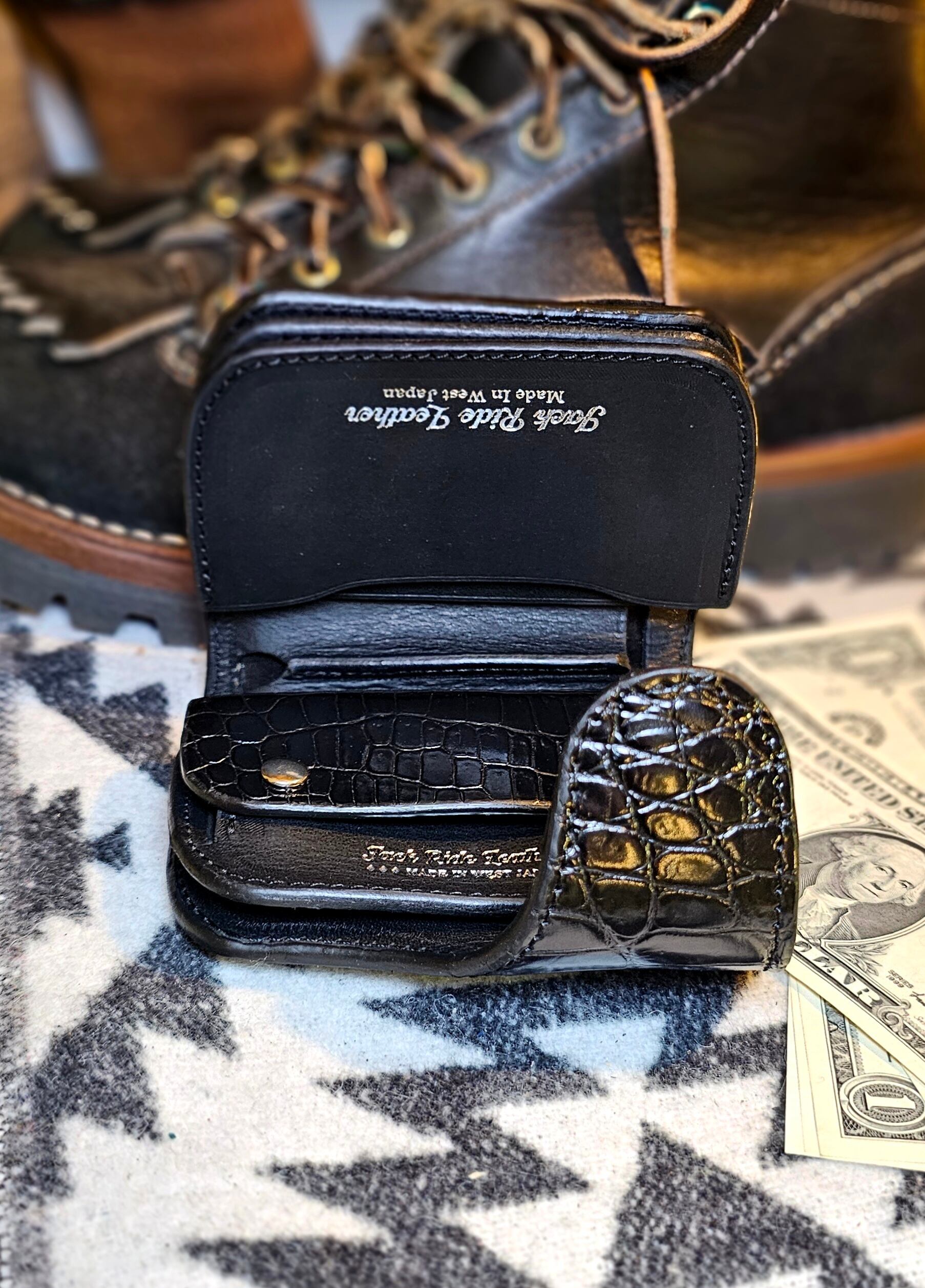表革とコインケース蓋部分に、ブラッククロコダイル(スモールクロコダイル)、裏貼りはピッグスキン(ブラック)を採用。